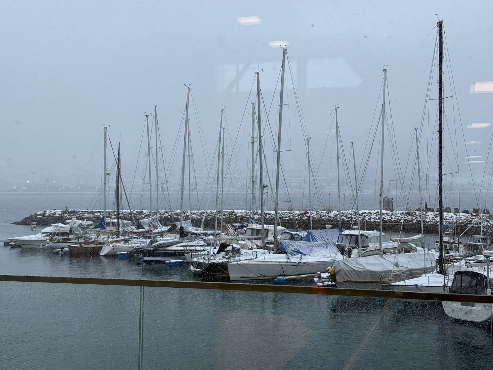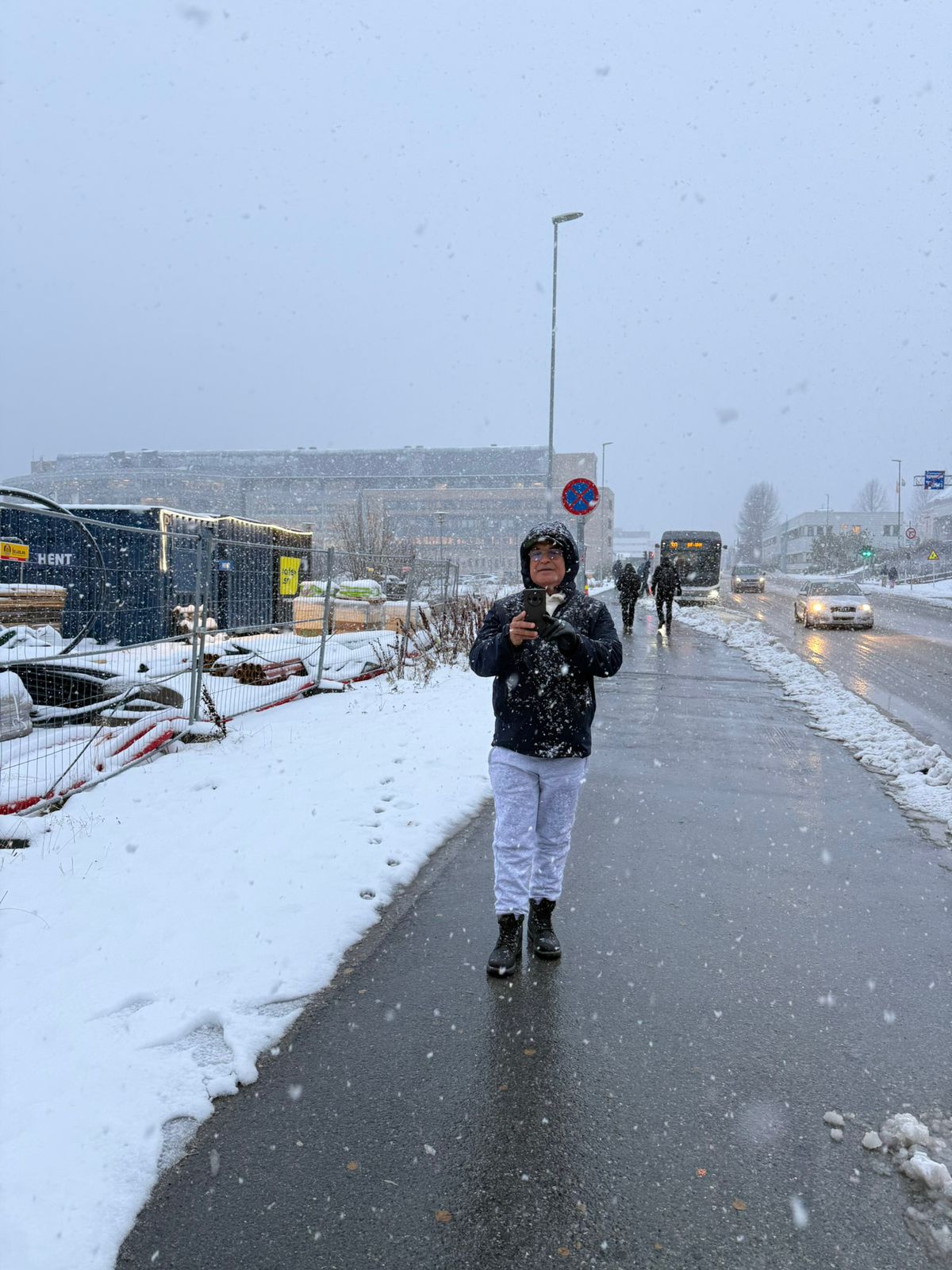 Só que… aí veio nosso primeiro perrengue: andar até a parada com mala, na neve com chuva, chão molhado, água, gelo e lama tudo misturado. O clima parecia não decidir se queria neve, água ou as duas coisas ao mesmo tempo.